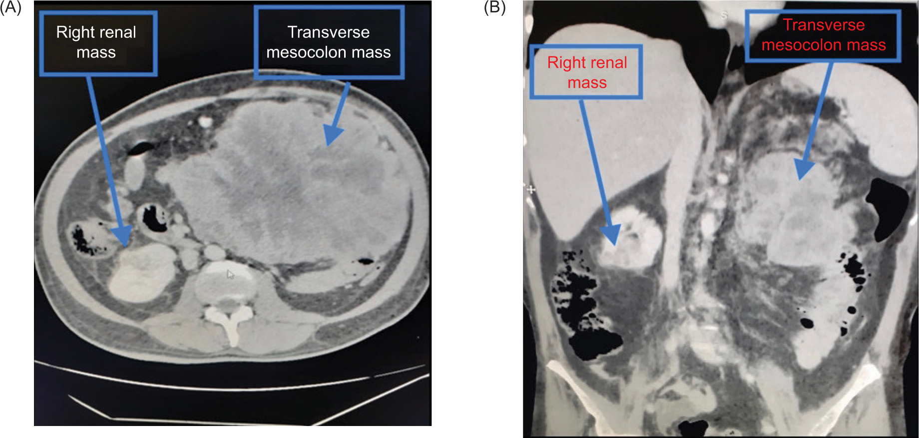 Figure 1: (A–B) Contrast-enhanced CT showing heterogeneously enhancing mass adjacent to the transverse colon and right lower pole kidney mass.