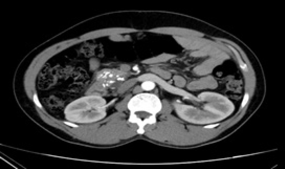 Figure 3: Computerized tomography (CT) scan after 3-year follow-up showing almost complete resolution of the mid-polar small renal mass in the right kidney.