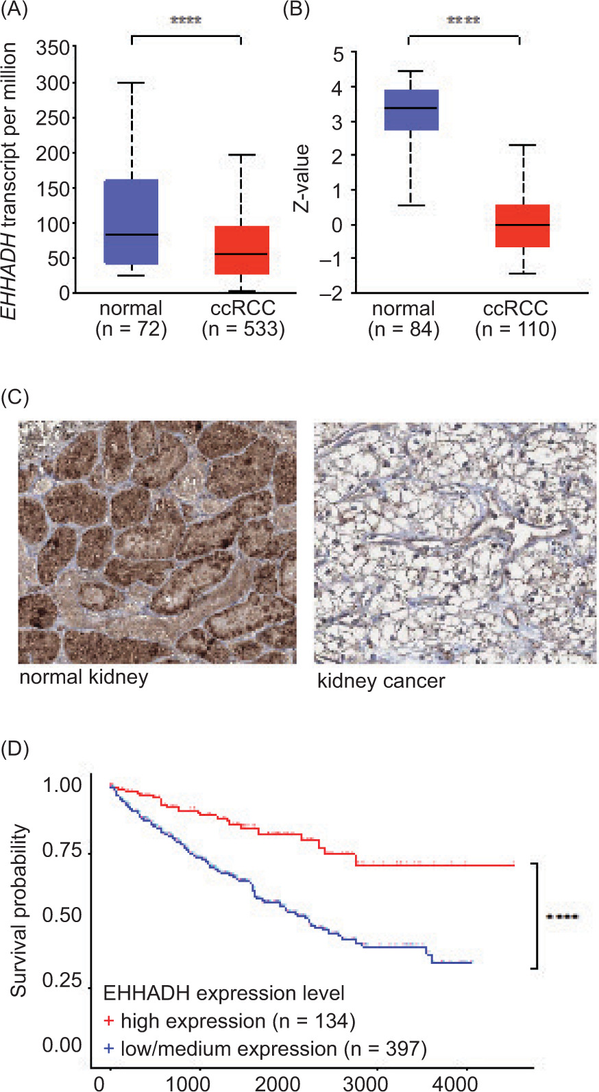 In summary, analysis of several databases revealed that EHHADH mRNA and protein expression is lower in kidney tumor samples than in control samples, and that reduced EHHADH expression correlates with poorer survival.