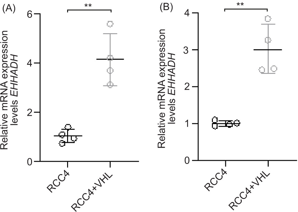 Figure 2: EHHADH mRNA levels are upregulated in the presence of VHL. qPCR analysis of relative EHHADH mRNA expression levels in RCC4 cells reconstituted with VHL (RCC4+VHL) compared to VHL-deficient RCC4 control cells (RCC4). Two different EHHADH primer sets, (A) primer_1 and (B) primer_2, were used. EHHADH expression levels were normalized to GAPDH. The four biological replicates of each experiment are shown as single values and mean +/- standard errors of the mean (SEM). **P < 0.01 (unpaired two-sample t-test).
