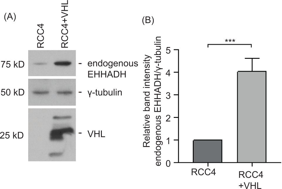 Moreover, cell lysates from RCC4 and RCC4+VHL cells were analyzed by Western blot using an anti-EHHADH antibody. RCC4+VHL cells showed a 4.0-fold higher relative band intensity of endogenous EHHADH than VHL-deficient RCC4 cells, indicating a significant difference in relative EHHADH expression between these two groups (Figure 3).