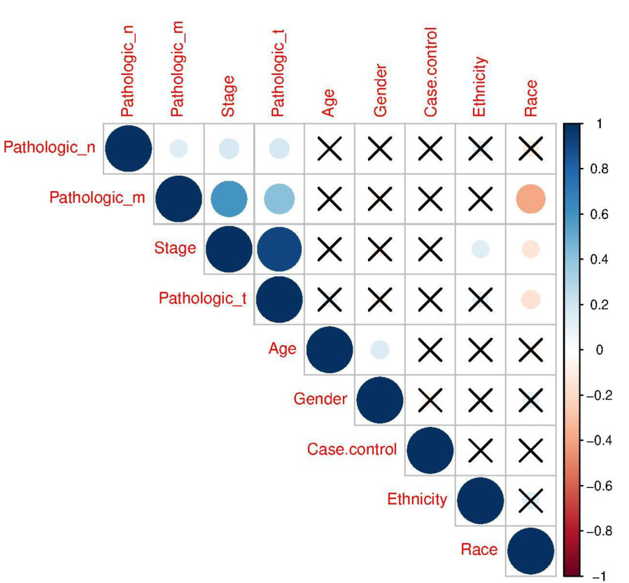 Figure 4: Correlation matrix shows significant co-relationship between clinical and demographic influence variables in PRCC; blue and red circles are displayed as positive and negative correlations, respectively. The size of circle and color intensity are associated with the correlation coefficients. The values of correlation coefficients are presented at the color intensity bar and the nonsignificant correlation is displayed in crosses.