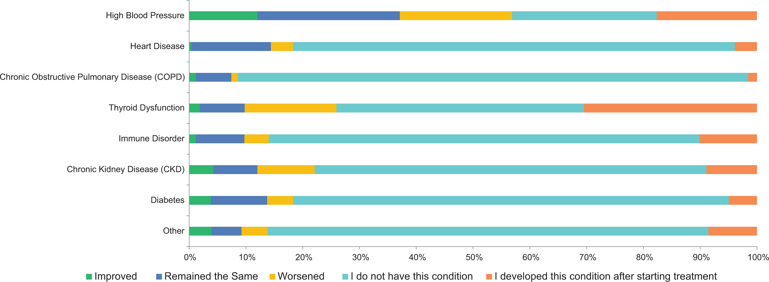 | Improved | Remained the same | Worsened | I do not have this condition | I developed this condition after starting treatment | Total | |