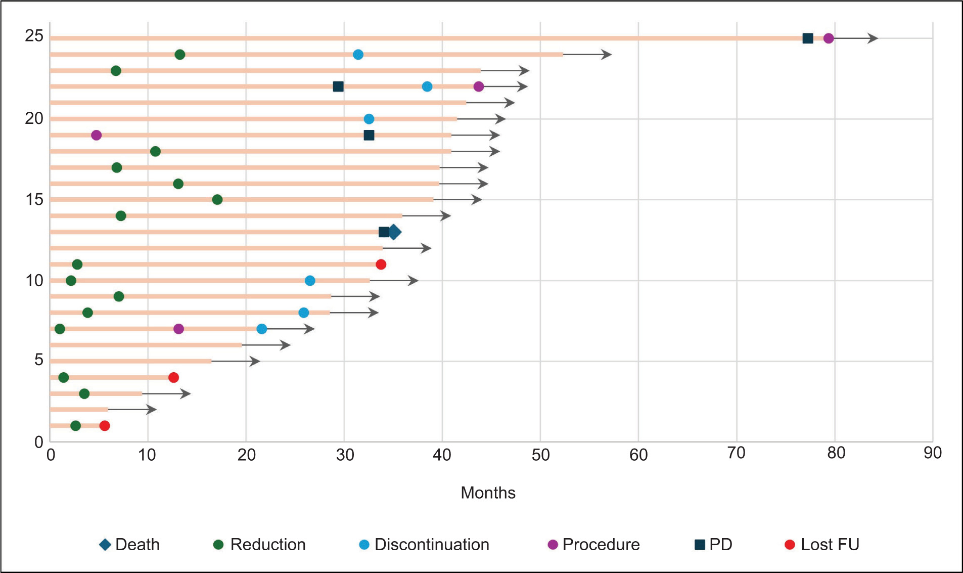 Among the 15 patients who underwent dose reduction, all patients were progression-free after a median follow-up of 27.7 months (range: 3–39) post-reduction.