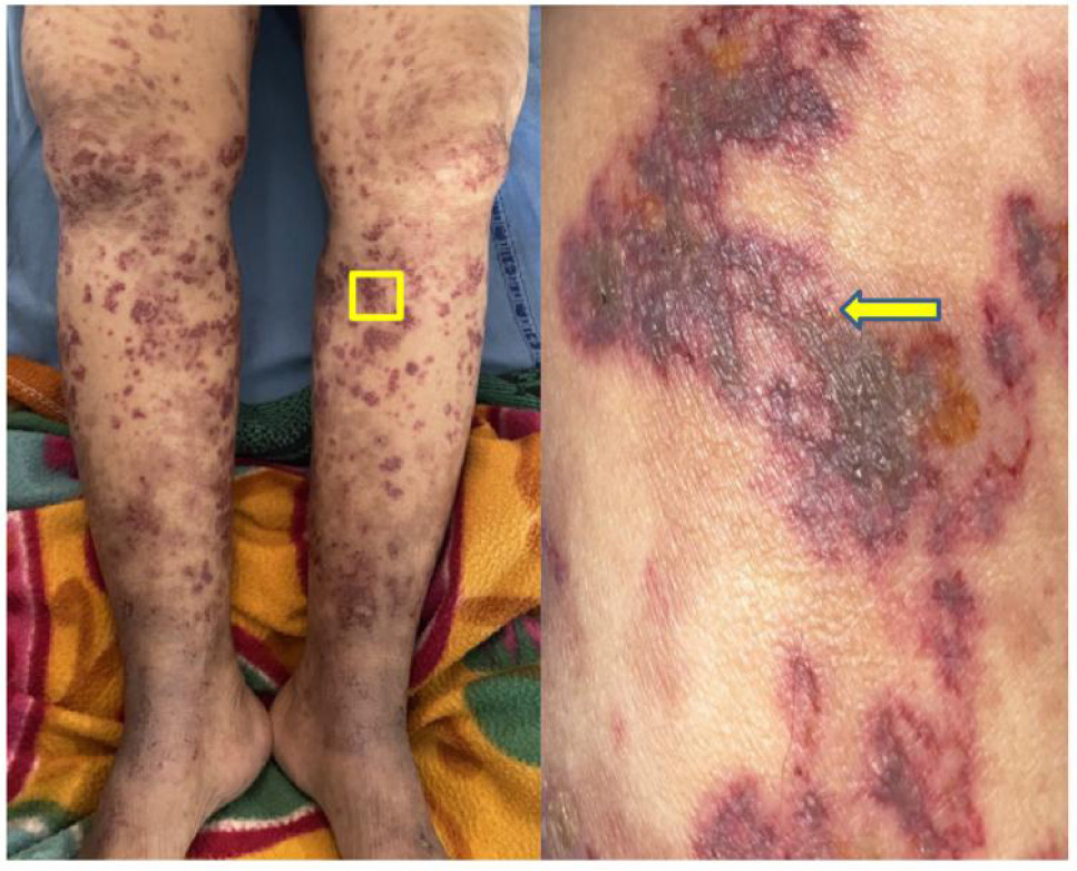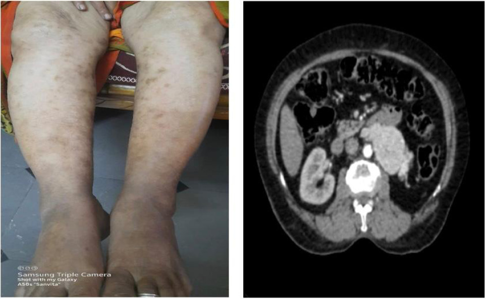 A 68-year-old female patient presented with a 2-month history of left flank pain and the development of red, raised lesions on both lower limbs. The pain started insidiously, described as a dull, continuous ache radiating to her back. Initially, the pain was mild and responded to oral analgesics. However, over time, the pain progressively worsened despite routine pain medications. Fifteen days later, the patient began noticing red, raised lesions on her ankles, which gradually spread to her knees. These lesions were associated with urticaria, occasional watery discharge, and intermittent pain.