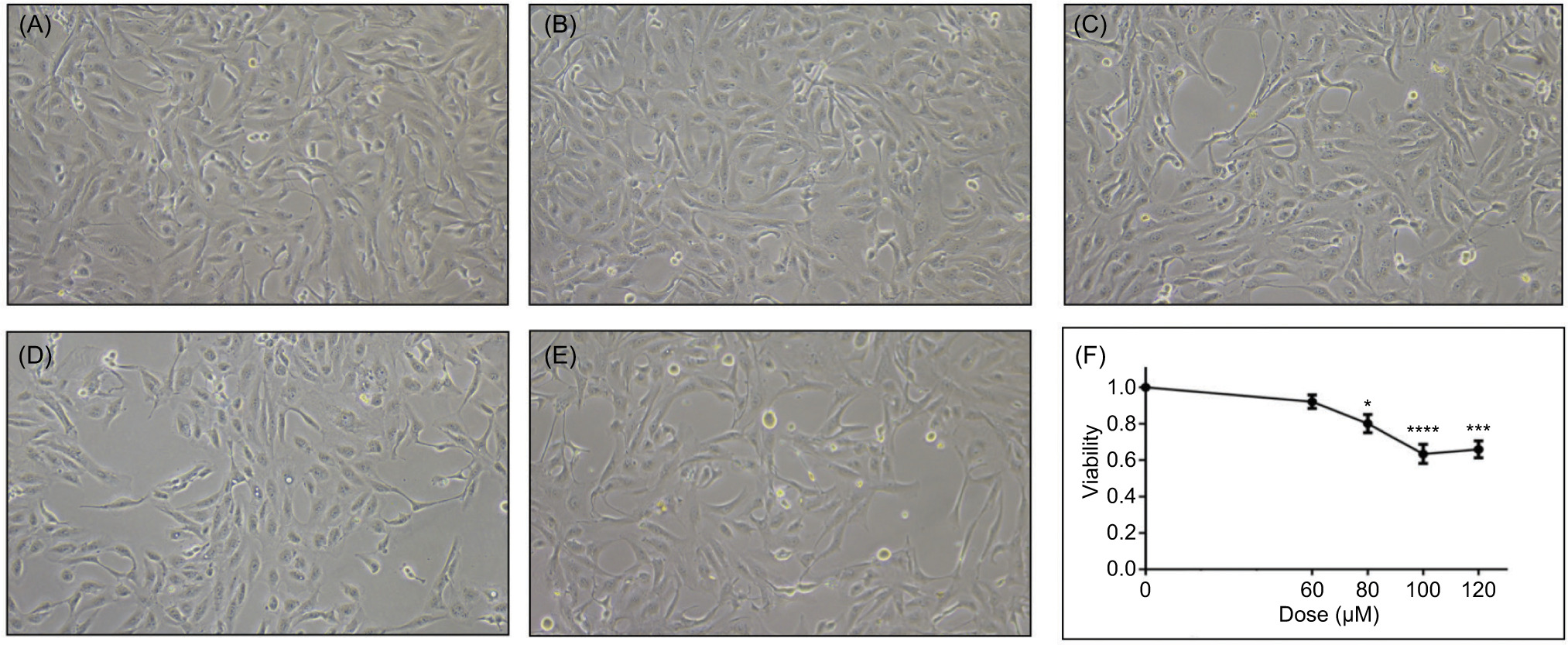 Figure 1: Zinc treatment modulates viability of 786-0 cells. (A–E) Representative phase-contrast microscopy images of 786-0 renal carcinoma cells cultured under normoxic conditions and treated for 24 hours with increasing concentrations of ZnCl2. (A) Untreated control; (B) 60 µM ZnCl2; (C) 80 µM ZnCl2; (D) 100 µM ZnCl2; and (E) 120 µM ZnCl2. A gradual reduction in cell confluence and density is observed with increasing zinc concentrations, particularly at 100 µM. (F) Cell viability assessed by MTS assay after 24-hour treatment with ZnCl2. Significant reductions were observed at 80 µM (80% ± 4%, *p < 0.05), 100 µM (60% ± 5%, ****p < 0.0001), and 120 µM (65% ± 4%, ***p < 0.001) compared to untreated controls. Data are expressed as mean ± SEM (n = 3). Statistical significance was determined using one-way ANOVA followed by Bonferroni’s post hoc test. Scale bar: 100 µm.