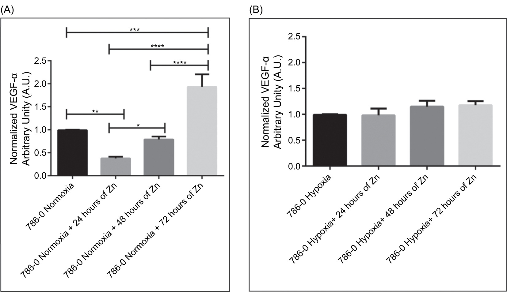 Figure 4: Temporal modulation of VEGF-α secretion by Zn differs between normoxia and hypoxia. (A) VEGF-α levels in 786-0 cell culture supernatants under normoxic conditions following treatment with 100 µM ZnCl2 for 24, 48, or 72 hours. ELISA quantification revealed a significant decrease at 24 hours (**P < 0.01), followed by a progressive increase at 48 (*P < 0.05) and 72 hours (****P < 0.0001), suggesting a biphasic response. (B) Under hypoxic conditions, VEGF-α secretion remained stable across all time points, with no significant changes upon zinc treatment. Values are normalized to respective untreated controls and expressed in arbitrary units (A.U.). Data represent mean ± SEM (n = 3). Statistical significance was determined by one-way ANOVA followed by Bonferroni’s test. *p < 0.05; **p < 0.01; ***p < 0.001; and ****p < 0.0001.