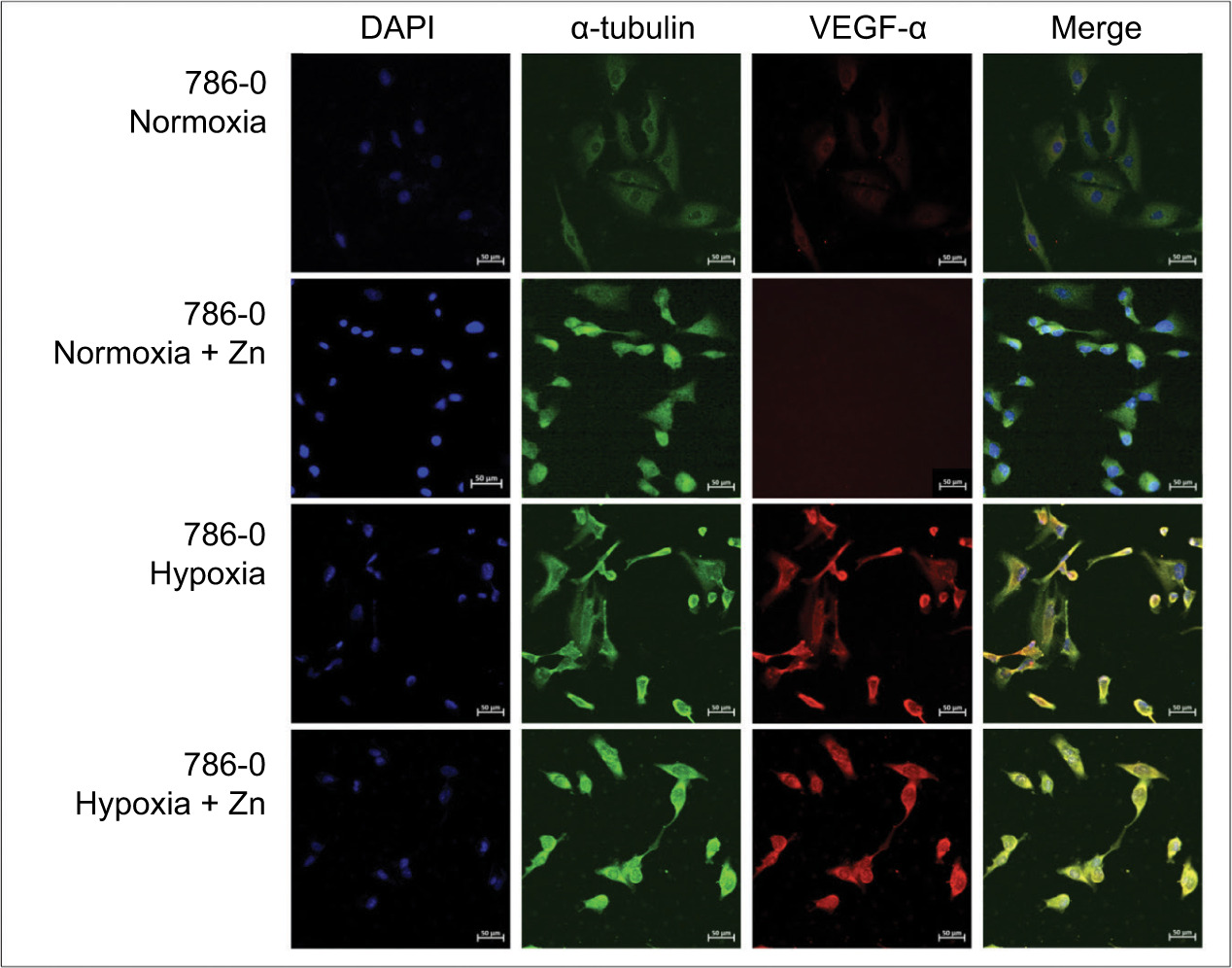 Figure 6: Immunofluorescence analysis of VEGF-α distribution in 786-0 Cells treated with Zn under different oxygen conditions. Representative immunofluorescence images of VEGF-α (red), α-tubulin (green), and nuclei (DAPI, blue) in 786-0 cells cultured under normoxic or hypoxic conditions, with or without zinc treatment (ZnCl2, 100 µM, 24 hours). Under normoxia, VEGF-α exhibited diffuse cytoplasmic staining that was markedly reduced following zinc supplementation. In contrast, under hypoxia, VEGF-α staining remained prominent in spite of Zn exposure. Original magnification: 20×. Scale bar: 50 µm.