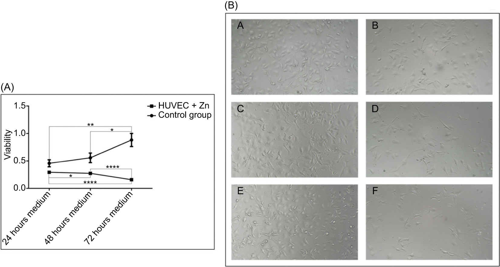 Figure 8: Conditioned media from zinc-treated tumor cells progressively impair HUVEC viability. (A) Viability of HUVECs exposed for 24 hours to conditioned media from 786-0 cells treated with 100 µM ZnCl2 for 24, 48, and 72 hours, assessed using the MTS assay. Endothelial viability progressively decreased with increasing tumor cell conditioning time, with significant reductions compared to controls. Mean viability was approximately 85% ± 4% after 24 hours, 40% ± 5% after 48 hours, and 35% ± 6% after 72 hours of exposure to zinc-conditioned media (****p < 0.0001 vs. respective controls). Data represent mean ± SEM (n = 3). Statistical analysis was performed using one-way ANOVA followed by Bonferroni’s post hoc test (*p < 0.05; **p < 0.01 and ****p < 0.0001). (B) Representative phase-contrast microscopy images of HUVECs exposed to control or zinc-conditioned media. Panels: (7B-A) 24-hour control; (7B-B) 24-hour Zn; (7B-C) 48-hour control; (7B-D) 48-hour Zn; (7B-E) 72-hour control; (7B-F) 72-hour Zn. Reduced cell density is evident in zinc-conditioned groups, while morphology remained preserved. Scale bar: 100 µm.
