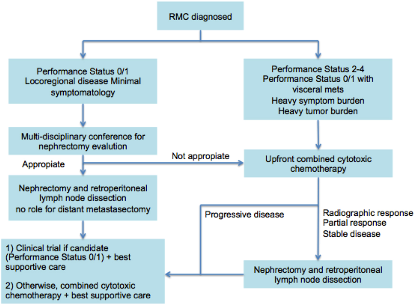A recent study (37) carried out on 52 patients described the management and outcomes of RMC patients, featuring predictors of overall survival. The vast majority of patients presented with advanced stage of disease, but three patients who had local disease, developed tumor recurrence within a few months after nephrectomy (median time of 3 months). In this study, the overall median survival was 13 months in comparison with the historic 5 months. The prognosis remained low, and <20% of patients survived for 24 months. However, in well-selected patients who respond to initial chemotherapy, or with low volume of metastases, nephrectomy can potentially play an important role also in the metastatic setting, and resection of all visible retroperitoneal disease should be the target of surgery. The data show that the nephrectomy may have a therapeutic benefit upfront or after response to chemotherapy. However, the decision to perform nephrectomy is influenced by many variables specific to the patient. A thorough patient assessment and a multidisciplinary deliberation are needed before a surgical treatment plan. In relation to these data, an algorithm has been recommended for RMC treatment (Figure 1) (37). The authors recommend the use of combined cytotoxic chemotherapy over single agents or targeted therapies, in particular for the palliation of ­symptoms. They also suggest the next frontier of RMC research is the molecular characterization in order to detect biologically relevant targets that can be exploited for the development of targeted therapies (37). As already mentioned, RMC is correlated with the loss of SMARCB1, a tumor suppressor gene on chromosome 22 (7, 38, 39). SMARCB1 acts as regulator of the remodeling of a repressor of transcription of cyclin D1. Therefore, the loss of SMARCB1 leads to an increase of the transcription of cyclin D1 in RMC (40). This results in the overexpression of Enhancer of zeste homolog 2 (EZH2) (a histone methyltransferase). For this reason, EZH2 inhibitors such as tazemetostat are used as therapeutic options (7, 41).