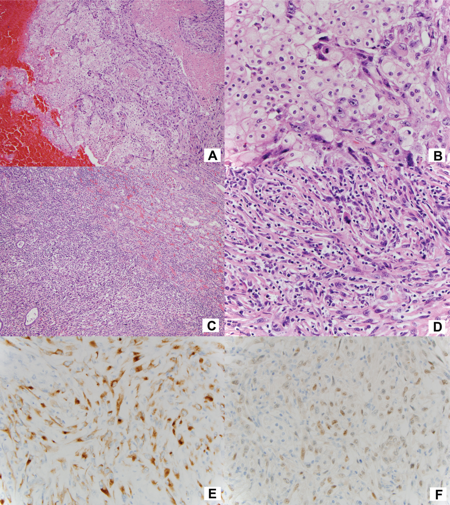 Figure 1. (A) Chromophobe carcinoma mixed with sarcomatoid carcinoma, (B) high power of (A), (C) pure sarcomatoid carcinoma invading the renal parenchyma, (D) high power of the sarcomatoid carcinoma, (E) positive CAM 5.2 (keratin) staining, and (F) positive PAX8 staining.