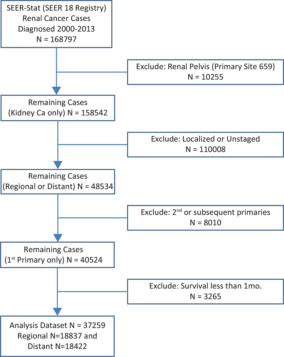 The National Cancer Institute Surveillance, Epidemiology, and End Results Program (SEER-18) contains regional research data (1973–2011) submitted in November 2013 with the Katrina/Rita population adjustment, collected from 18 American cancer registries, chosen for their data quality and population diversity. The MDCSS is a data contributor to the SEER Program. Data for the primary analyses were extracted using SEER*Stat software (version 8.3.1), for patients diagnosed with renal cancer between the years 2000 and 2013. We restricted the analysis to the first diagnosis of regional or distant stage kidney cancer, overall referred to as “metastatic” kidney cancer. Site-specific surgery codes 30, 40, 50, 70, or 80 were defined as having received nephrectomy. The main focus was advanced or metastatic cases with RCC which are coded as “distant” in SEER. Logistic regression analysis was used to calculate odds ratios (OR) of a patient who has undergone nephrectomy, adjusted for age at diagnosis, race, gender, marital status, insurance and disease histology, and grade. Cox proportional hazards regression analysis was used to calculate adjusted hazard ratios (HR) to estimate the overall risk of death. Hazard ratios were adjusted for nephrectomy as well as for all other variables listed above. Analyses were conducted using SAS software version 9.4 (SAS Institute Inc., Cary, NC). Patients with OS < 1 month were excluded from the analysis with the assumption that any treatment would not have a chance to impact their outcomes. Figure 1 depicts the flowchart of the patient population considered and selected for analysis.