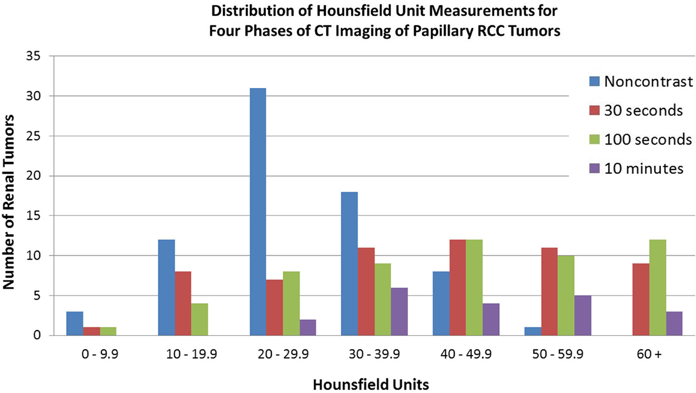 In all cases, four CT scan phases were analyzed to obtain renal tumor characteristics—non-contrast, corticomedullary, nephrographic, and pyelographic. Approximate times following intravenous contrast for the contrast phases were 30 s, 100 s, and 10 min, respectively, although there were minor variations. CT phases were available in various combinations as preoperative imaging selection was patient-dependent. For each phase, the renal tumor was assessed for maximum dimension in millimeters in all projections. The tumor was then assessed for density in the axial projection by selecting 6 evenly spaced axial regions and using the imaging software to calculate HU. These six values were averaged and recorded. This method has been utilized previously in the literature and represents a real-world approach clinicians employ when reviewing CT imaging. Preliminary comparisons between using six evenly spaced regions versus all regions confirmed the validity of this approach. Tumors were grouped in increments of 10 HU to determine the frequency of observed preoperative imaging density.