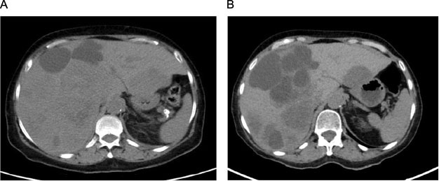 Figure 1: (A) Computed tomography (CT) abdomen and pelvis (pre-treatment) showing hepatomegaly and several hypodense lesions throughout the liver parenchyma consistent with liver metastases. (B) CT abdomen and pelvis (post-treatment) showing enlargement of existing lesions and new hepatic metastases.