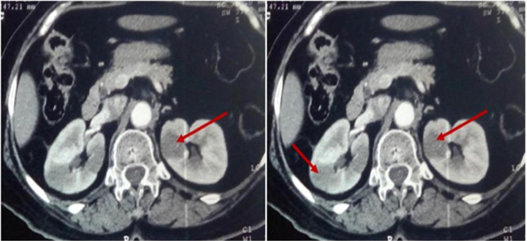 In 2005, a 66-year-old female consulted for nasal obstruction and rhinorrhea evolving since 8 months. Clinical examination documented a left polypoid nasal lesion; tumor biopsy revealed an ACC. The patient underwent surgery followed by radiation therapy (64Gy). During follow-up, after 8 years, the patient presented a distant recurrence of the disease with solitaire lung metastases. No local relapse was observed. Metastasectomy of the lesion was practiced with economic margins, followed by radiotherapy (60Gy). In April 2019, the patient presented at the hospital for a pain in the right flank. No other symptoms were reported. Computed tomography (CT) of the abdomen showed multiple hypodense nodular lesions of the two kidneys, the larger one measuring 30 × 25 × 40 mm in the right kidney (Figure 1).