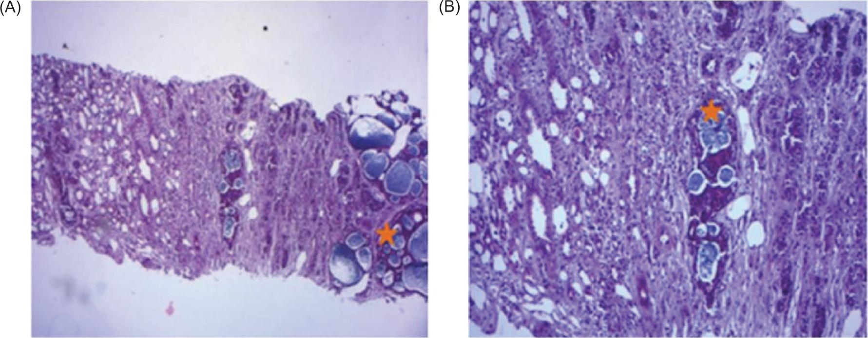Figure 2: (A) H&E photomicrographs showing renal localization of adenoid cystic carcinoma (*) with various growth patterns: Cribriform and trabecular, a characteristic cribriform pattern of adenoid cystic carcinoma (hematoxylin-eosin, ×100). (B) Cribriform growth pattern displaying several prominent pseudocysts surrounded by basaloid cells (hematoxylin-eosin, ×200); Arrows indicate renal tubules.