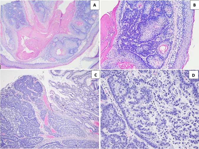Figure 2: (A) Sebaceous adenoma in the dermis with cystic dilatation (Hematoxylin and Eosin ×40). (B) Proliferation of germinative cells in the sebaceous adenoma (Hematoxylin and Eosin ×200). (C) Low magnification view of the colonic adenocarcinoma with normal colon on the right and the adenocarcinoma with mostly solid architecture (Hematoxylin and Eosin ×40). (D) Poorly differentiated adenocarcinoma of colon with pleomorphic tumor cells and poorly formed glands with some extracellular and intracellular mucin (Hematoxylin and Eosin ×200).