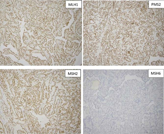 Figure 5: Immunohistochemical stain for mismatch repair proteins showing loss of expression of MSH6 and preserved nuclear expression of MLH1, PMS2, and MSH2.