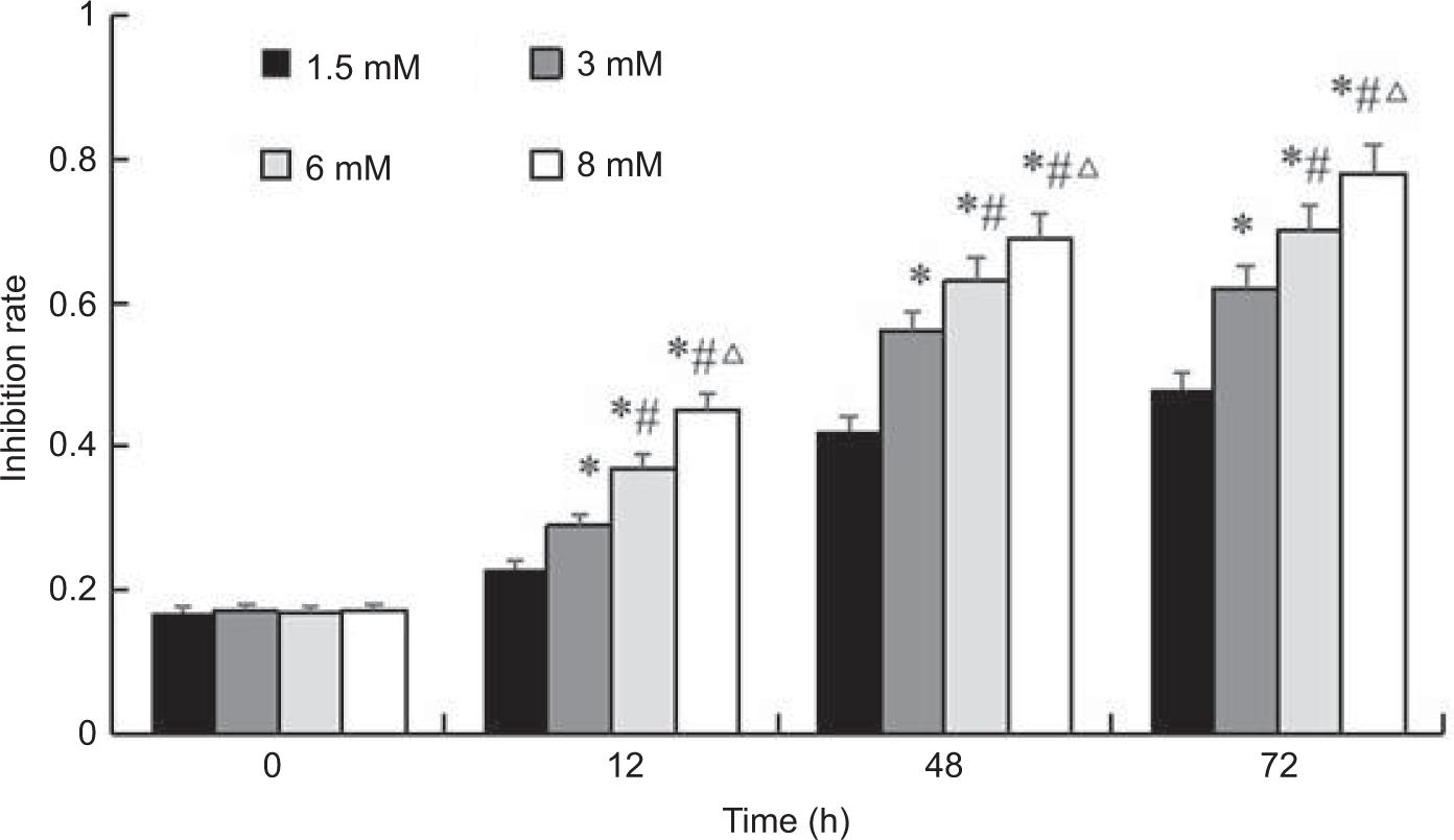 Figure 1: The growth inhibition effect of ligustrazine on A498 cells by MTT assay. The cells were treatment with ligustrazine at each concentration for 24, 48 and 72 h.