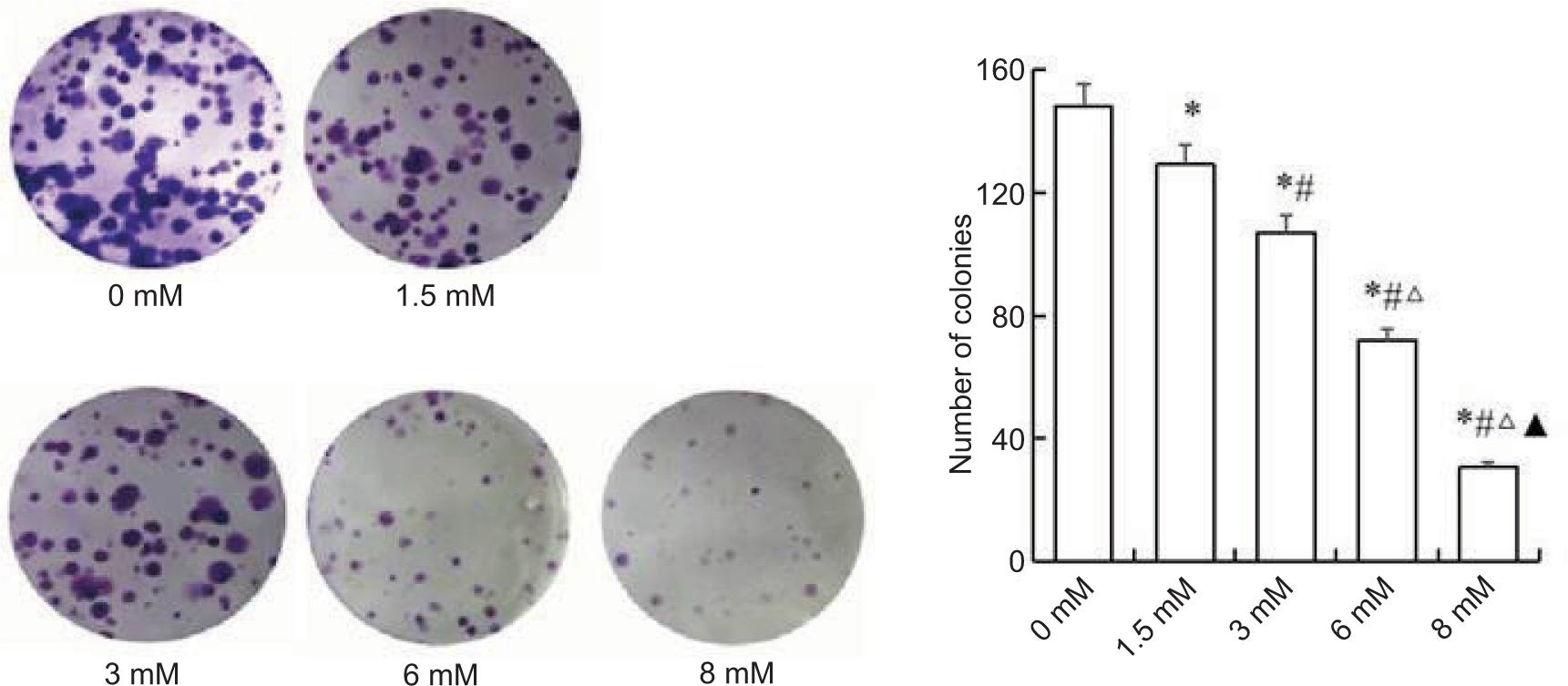 Figure 3: Tumor cell clone formation assays. ligustrazine significantly reduced colony-forming efficiency in a dose-dependent manner.