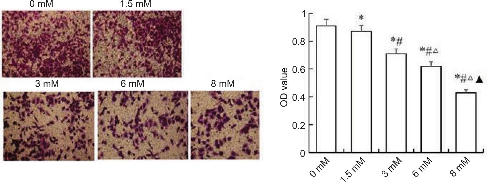 Figure 4: Cell migration analysis by transwell assays. ligustrazine significantly reduced the ability of A498 cells migration in a dose-dependent manner.