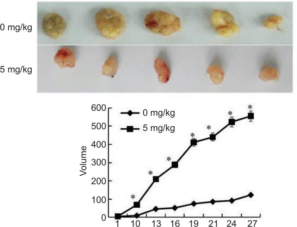 Figure 5: Effect of ligustrazine on growth of tumors. 5 mg/kg of ligustrazine subcutaneously in nude mice.
