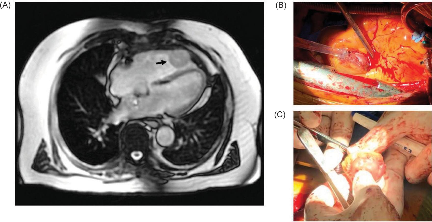 Figure 1: A 77-year-old male with delayed isolated cardiac metastasis from renal cell carcinoma; (A) Computed tomography demonstrating an enhancing, circumscribed T2 hyperintense T1 isointense right ventricular mass at the ventricular apex measuring 3.5 × 3.3 cm (arrow); (B) Intraoperative image showing the cardiac metastasis identified in the right ventricular wall; (C) Intraoperative image showing the final resected specimen sent for targeted sequencing. A VHL mutation was identified c.494T > G (p.V165G) in exon 3 in 41% of 241 reads.
