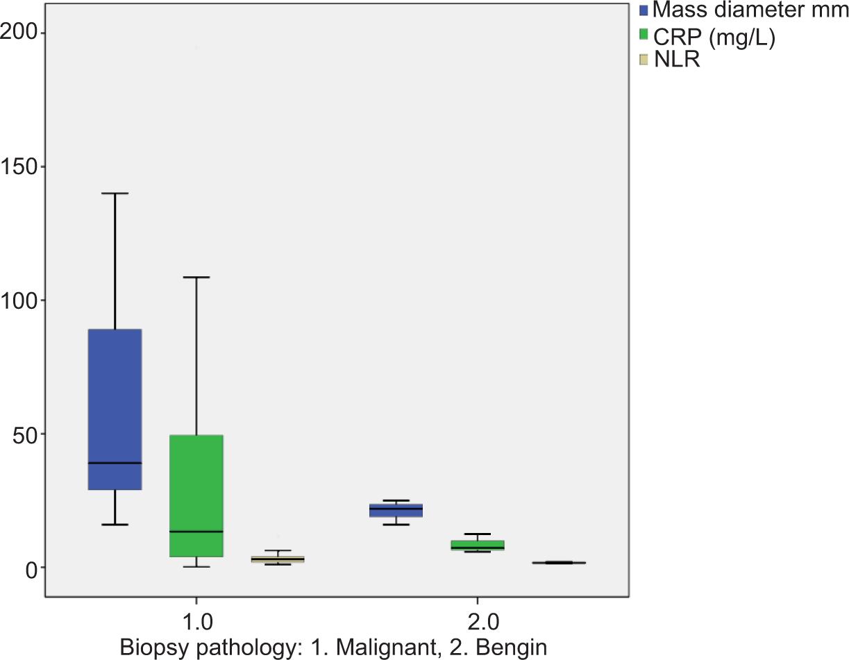 Because of the positive significant correlation of serum CRP and NLR levels with malignant mass diameter, we performed univariate and multivariate cox regression analyses in terms of determining their independent predictive roles. Our findings revealed that serum CRP was an independent predictor in determining the malignant renal mass after the biopsy.