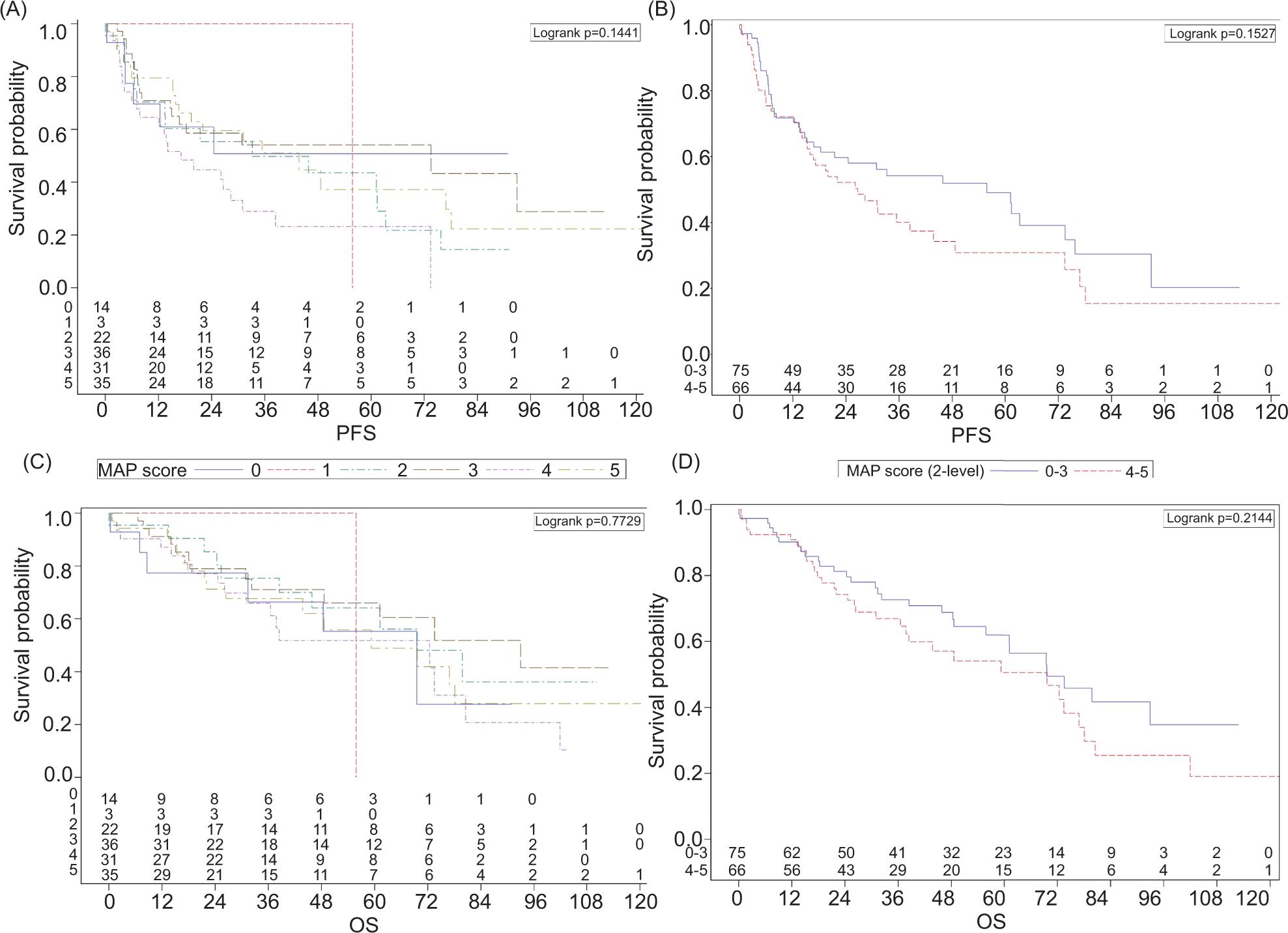 Figure 1: Kaplan–Meier curves for stage T3/T4 renal cell carcinoma patients (n = 141) displaying median progression-free survival (PFS) or overall survival (OS) with either individualized (0–5) or dichotomized (0–3 vs 4–5) Mayo Adhesive Probability (MAP) scores. (A) Median PFS with individualized MAP Scores. (B) Median PFS with dichotomized MAP scores. (C) Median PFS with individualized MAP Scores. (D) Median OS with dichotomized MAP scores.