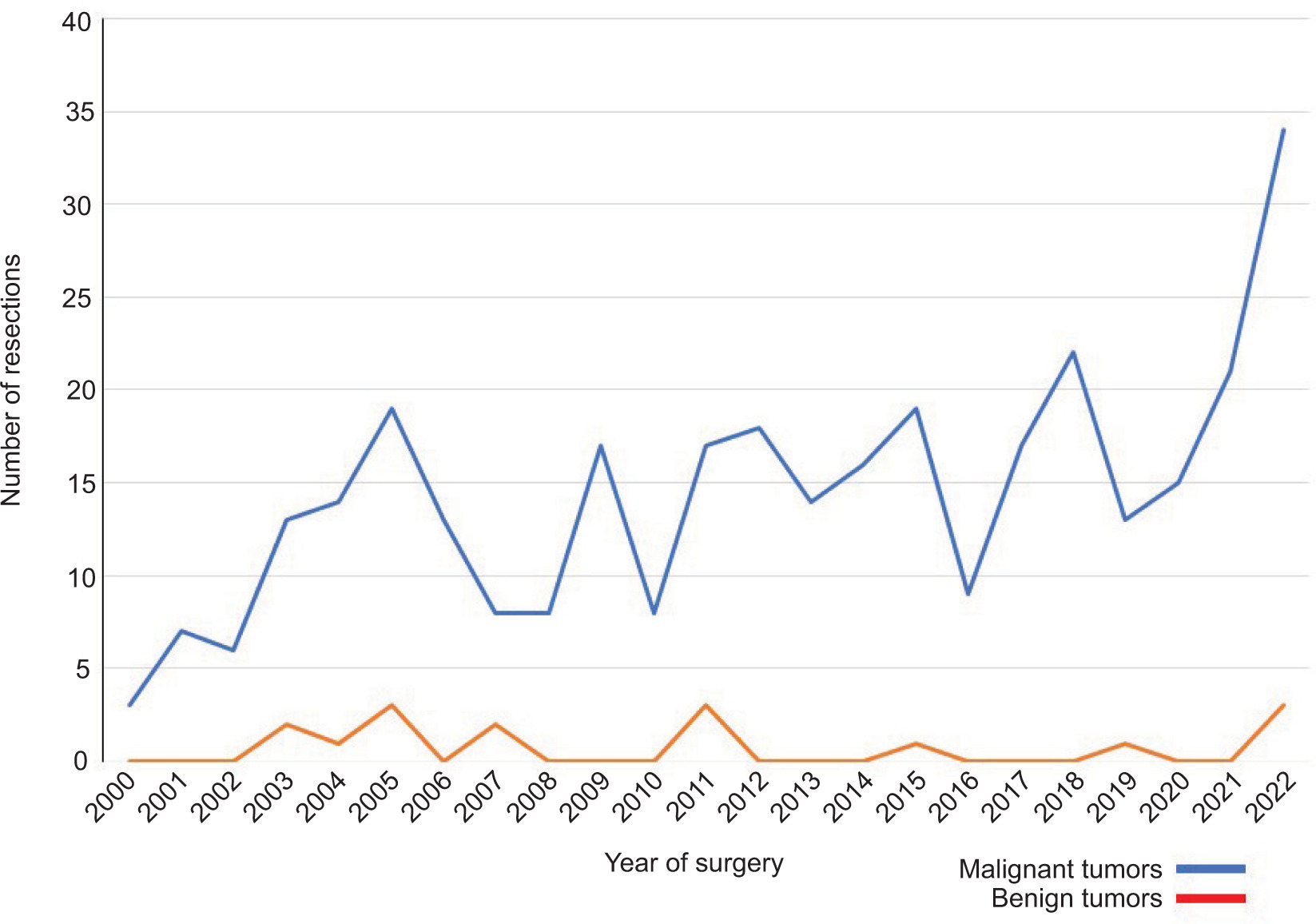 No significant trend was noted in the rate of benign resections per year (mean/range [%] = 3.3/0–15.8; Figure 1).