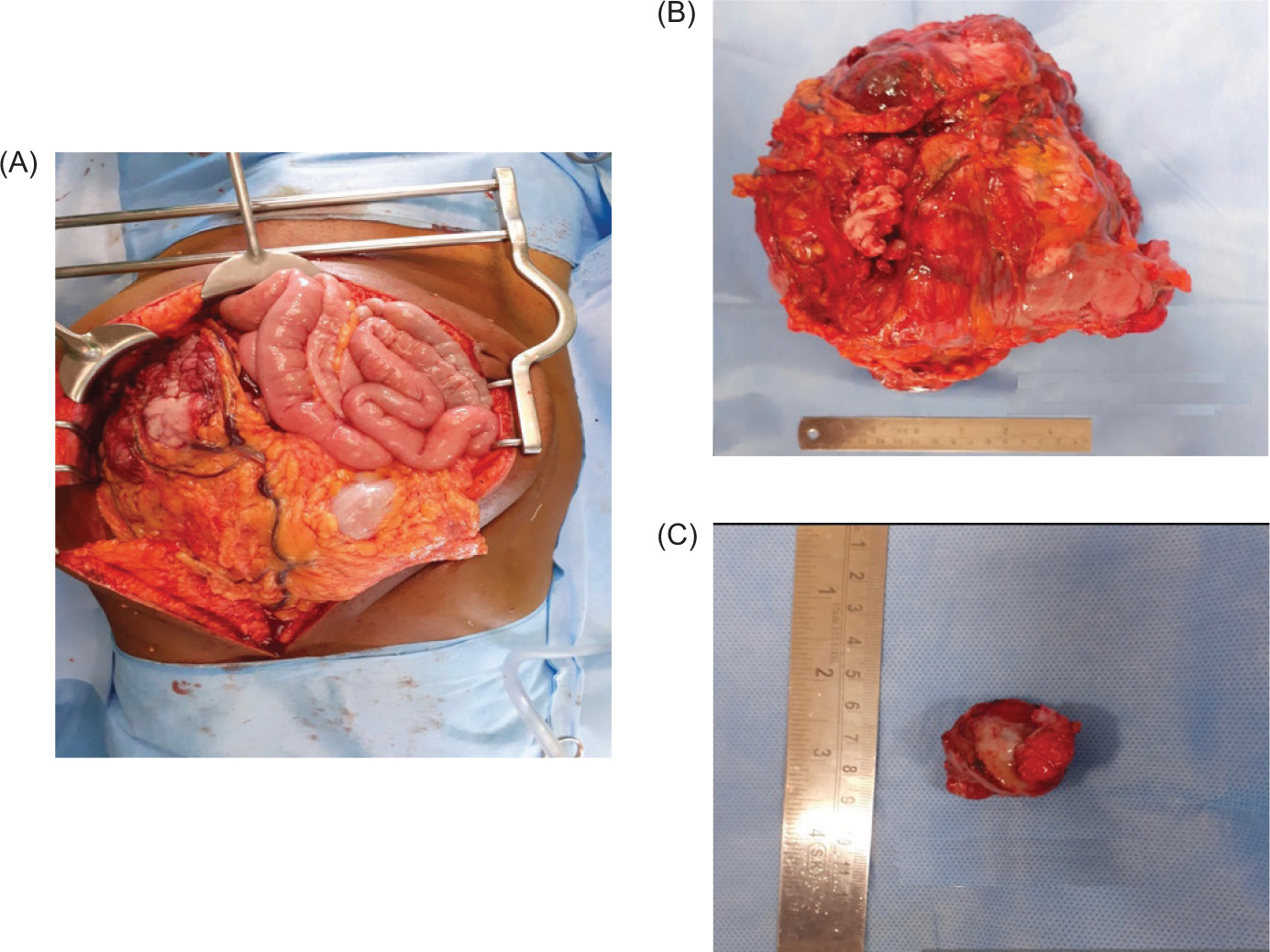 Figure 2: (A) Intraoperative image showing large mass adjacent to transverse colon. (B) Resected specimen of transverse colon mass. (C) Resected specimen of right renal mass.