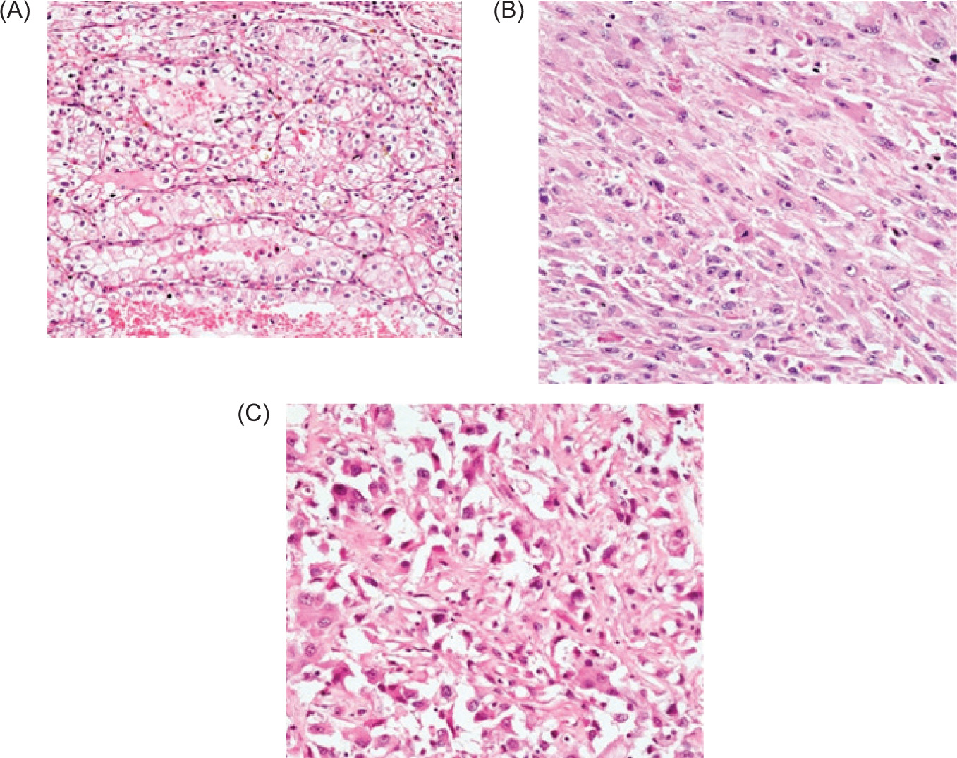 Figure 3: (A) Renal tumor showing glands lined by tumor cells with clear cytoplasm, well defined cell borders, and vesicular nuclei with small nucleoli. H&E 200×. (B) Spindle-shaped tumor cells show abundant cytoplasm with vesicular to hyperchromatic nuclei with prominent nucleoli and increased mitosis. H&E 200×. (C) Tumor cells with rhabdoid morphology shows hyperchromatic, pleomorphic nuclei with prominent nucleoli. H&E 200×.