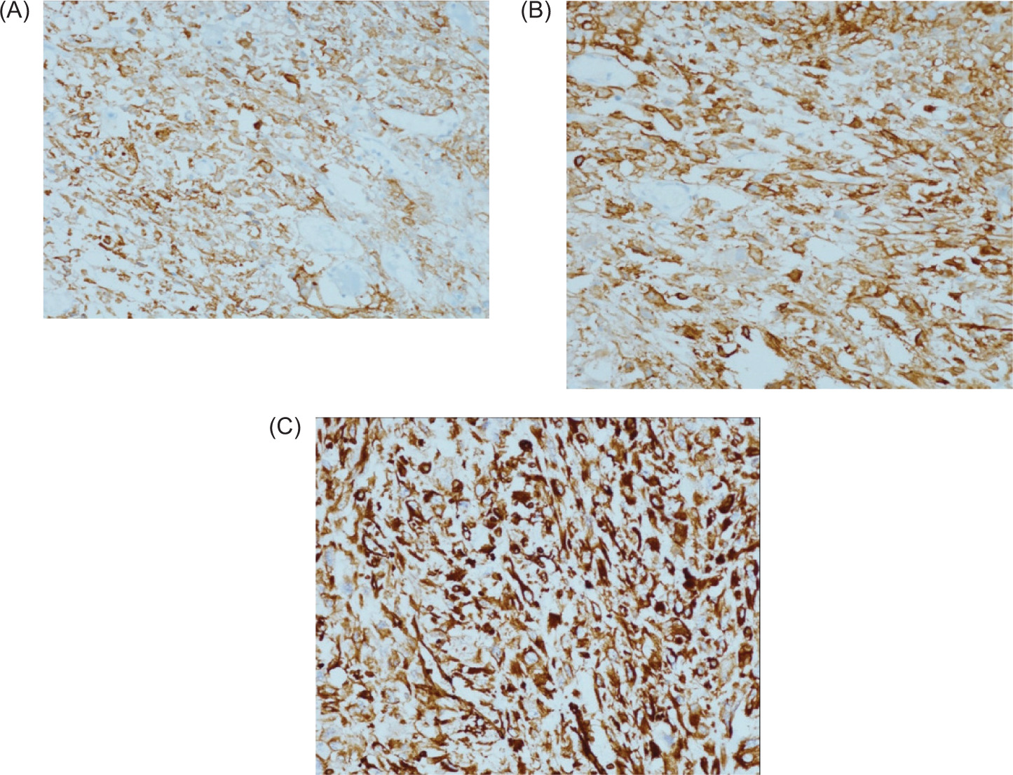 Figure 4: (A) Tumor cells express CD 10. DAB 200×. (B) Tumor cells express Carbonic Anhydrase 9. DAB 200×. (C) Tumor cells express vimentin. DAB 200×.