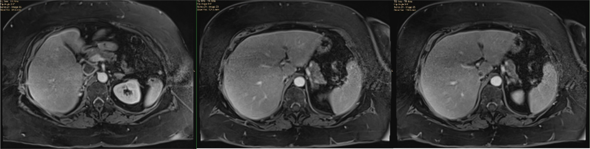 Figure 1: Pre-operative MRI showing tumor thrombus extending into the IVC below the major hepatic veins.