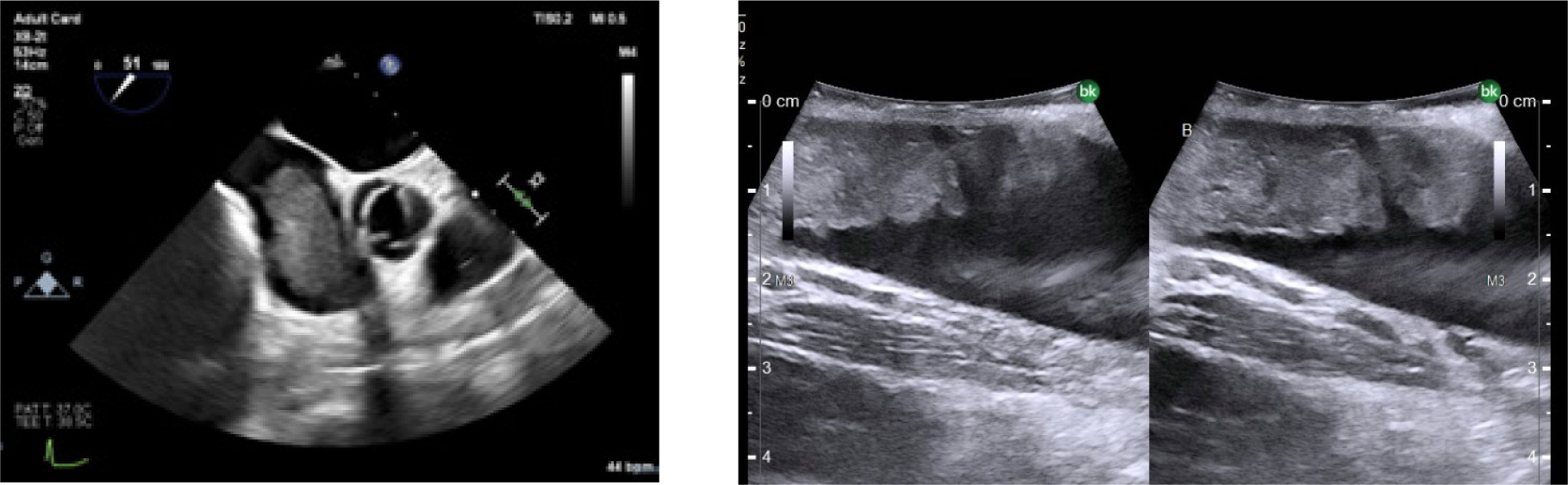 As the procedure above was completed, multidisciplinary assistance had arrived including cardiac surgery, interventional radiology, and multiple cardiac anesthesiologists. TEE showed significant intracardiac tumor thrombus now obstructing the right ventricular outflow and hemodynamic instability was worsening. Options for management were discussed including cardiopulmonary bypass (CPB) and embolectomy vs. endovascular extraction. Given the instability, thrombus size, and operating room location, it was felt that survival was most likely with CPB and embolectomy. A conference was held with the patient’s family and the surgical team to confirm that this would be within the patient’s goals of care.