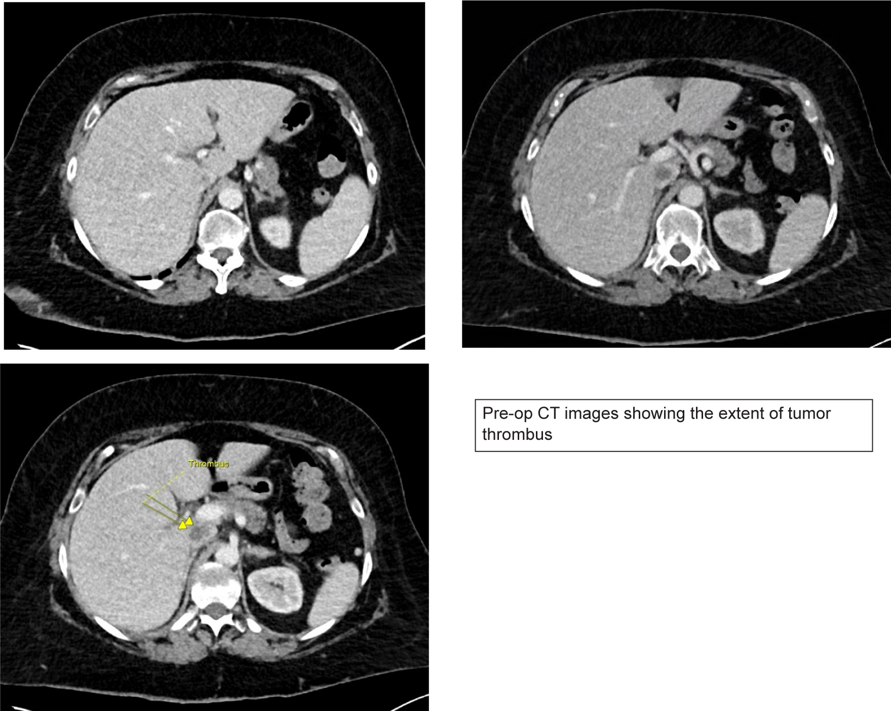 While awaiting assistance, a decision was made to emergently complete the nephrectomy and IVC thrombectomy. This was performed because: (i) most of the setup had been completed and it was felt that this could be completed expeditiously, (ii) significant heparin had been administered and the bleeding risk of the partially dissected kidney with significant neovascularization was felt to be high, (iii) there was a risk for further embolization with in situ tumor thrombus, and (iv) it would take time for assistance to arrive and set up.