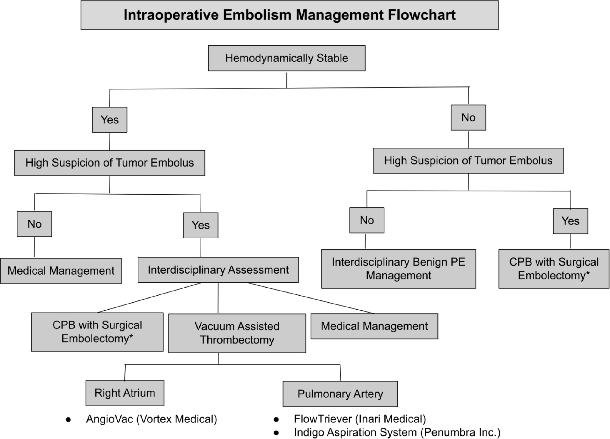 In the event of intraoperative embolization, we propose that management can be determined by three factors: hemodynamic status, suspicion of tumor thrombus, and location of the embolus. Patients with high suspicion of tumor embolus who are hemodynamically unstable should be managed using CPB and surgical embolectomy, regardless of the embolus location. However, if CPB is not available or if the patient is hemodynamically stable, VAT can be considered. If VAT is pursued, the location of the thrombus can be used to determine which technology would be best suited. The AngioVac system has been shown to be highly effective in acute RAT removal and should be first employed (15). If the embolus is in the pulmonary arteries, then FlowTriever and Indigo Aspiration System have been shown to be effective with less complications (15, 18–21).