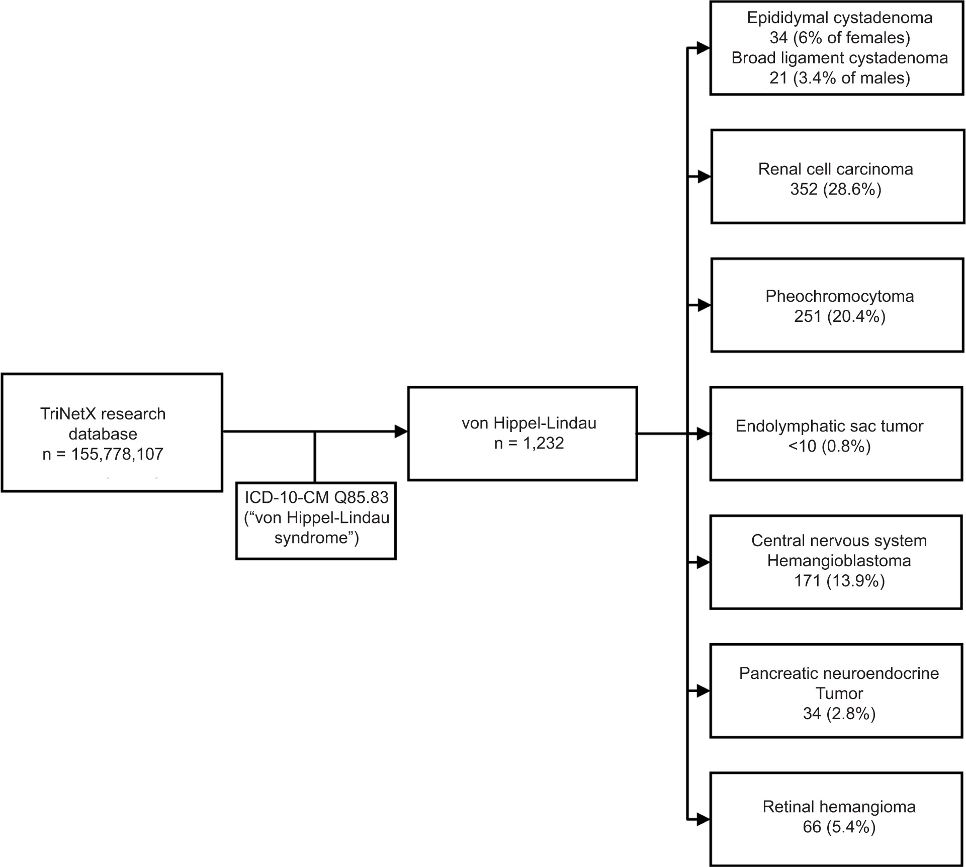 Our initial cohort consisted of all patients with vHL (ICD-10 Q85.83). With this cohort, we queried the database for common manifestations of vHL: reproductive organ cystadenomas, RCC, pheochromocytomas, ELSTs, CNS and retinal hemangioblastomas, and pNETs (Figure 1).