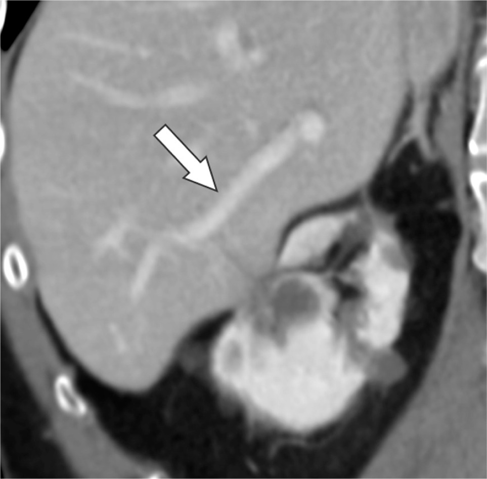 Figure 1: Oblique coronal contrast-enhanced CT before cryoablation reveals the normal liver parenchyma and patent portal vein branch (arrow).