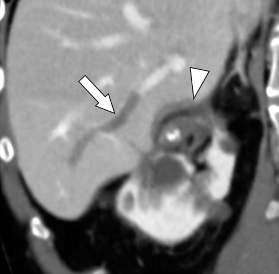 Figure 2: Oblique coronal contrast-enhanced CT 2 days after cryoablation reveals the ablated liver parenchyma (arrowhead) and portal venous thrombus (arrow).