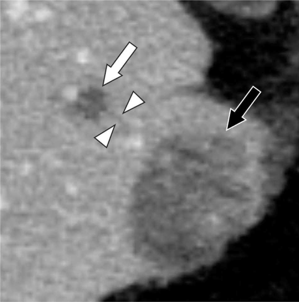 Figure 3: Axial contrast-enhanced CT 2 days after cryoablation reveals a small portal venous thrombus (arrowheads) adjacent to the subsegmental portal venous thrombus (white arrow) toward the ablation zone. There is no continuity between the small thrombus and the ablation zone (black arrow).