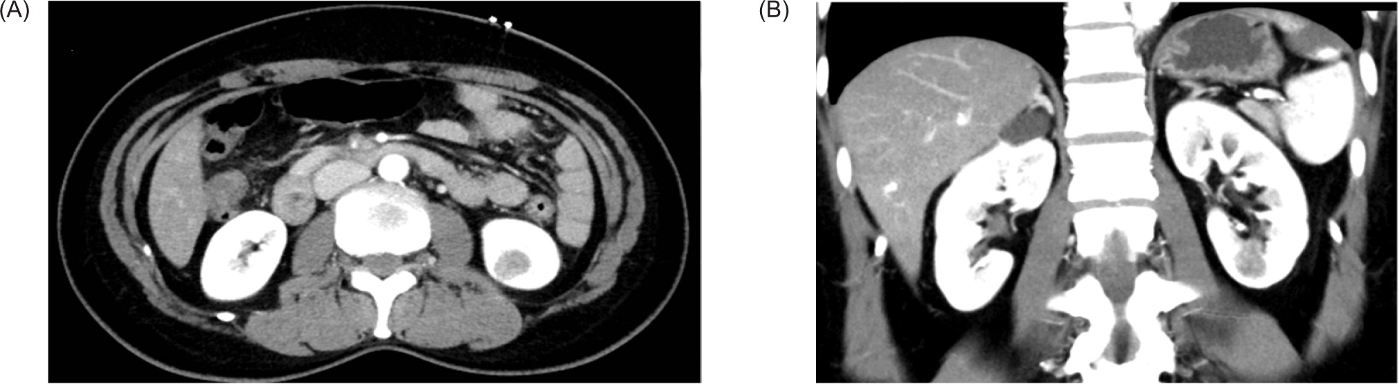 Figure 1: Contrast-enhanced computed tomography images. (A) axial image, (B) coronal image.