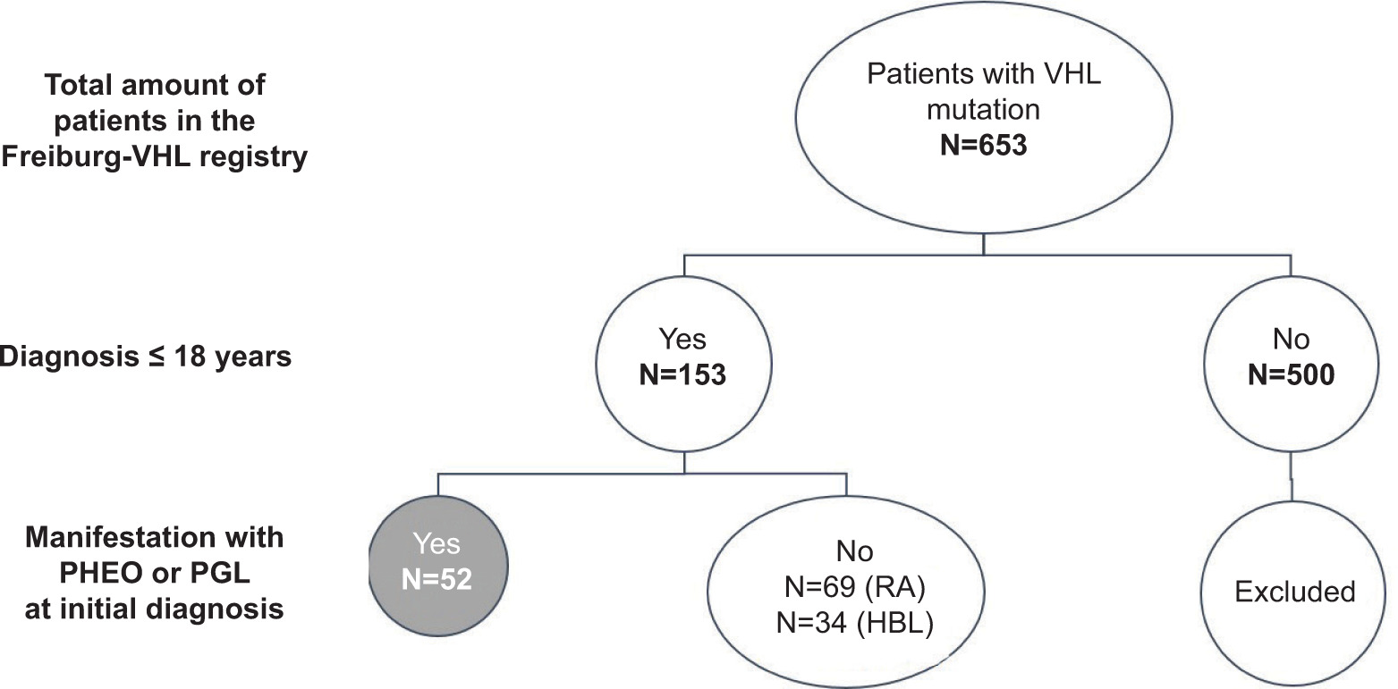 Demographic and clinical information was obtained from the registry and medical records at baseline and during follow-up. According to the current international recommendations, the Freiburg screening protocol of surveillance includes annual hormone level measurements (plasma and/or 24-h urine metanephrines), eye examination (starting at the age of 6), imaging of the abdomen and central nervous system (CNS) (starting at the age 12) usually by magnetic resonance imaging (MRI) and positron emission tomography (PET) scanning with 68Ga-peptides. PPGL was diagnosed by histology, when available, or through the combination of biochemical assays and MRI imaging. The clinical follow-up data collected in the Freiburg-VHL registry were available for 52 patients. Patients had at least two screenings at the VHL center, with on average of 1.2 screening annually. Of the 21 overlap patients of the two registries, only baseline data and no follow-up data were available for 10 Freiburg-VHL and 13 GPOH-MET patients.