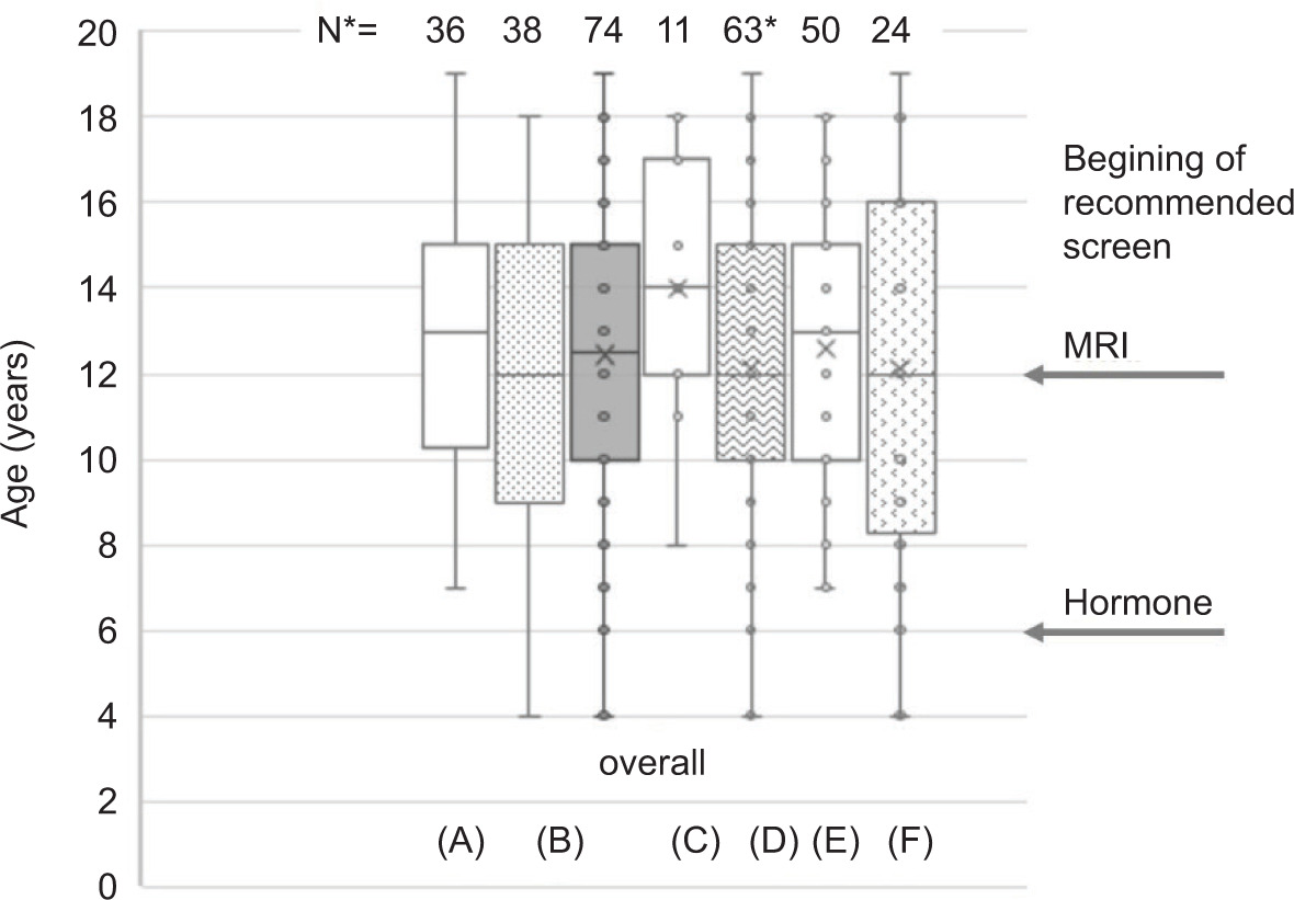 Figure S3: Overview of the age at first PPGL manifestation. Barplots show age at the first PPGL manifestation; N: number of patients with first PPGL manifestation. Overall (dark barplot in the middle), data of 74 patients are included. *Missing = 1 patient (diagnosed clinically with PGL, histologically not confirmed at the end of the study). Subgroups (mean ± SD): (A) First manifestation under surveillance (12.0 ± 3.8 years); (B) first manifestation before baseline screening (12.9 ± 3.2 years); (C) reason of diagnosis, genetic (14.0 ± 3.1 years); (D) reason of diagnosis, clinical (12.1 ± 3.6 years), **for three patients no data for initial diagnosis were available; (E) family history positive (12.6 ± 3.0 years); and (F) family history negative (12.1 ± 4.5 years). Recommended screening with hormone measurements starts at the age of 6 years, and MRI screening starts at the age of 12 years.