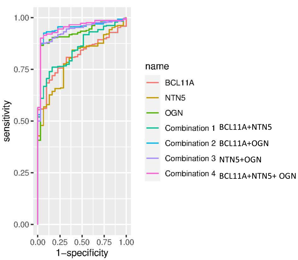 Table 4: Results of diagnosis tests performed for BCL11A, NTN5, OGN, and their combinations.