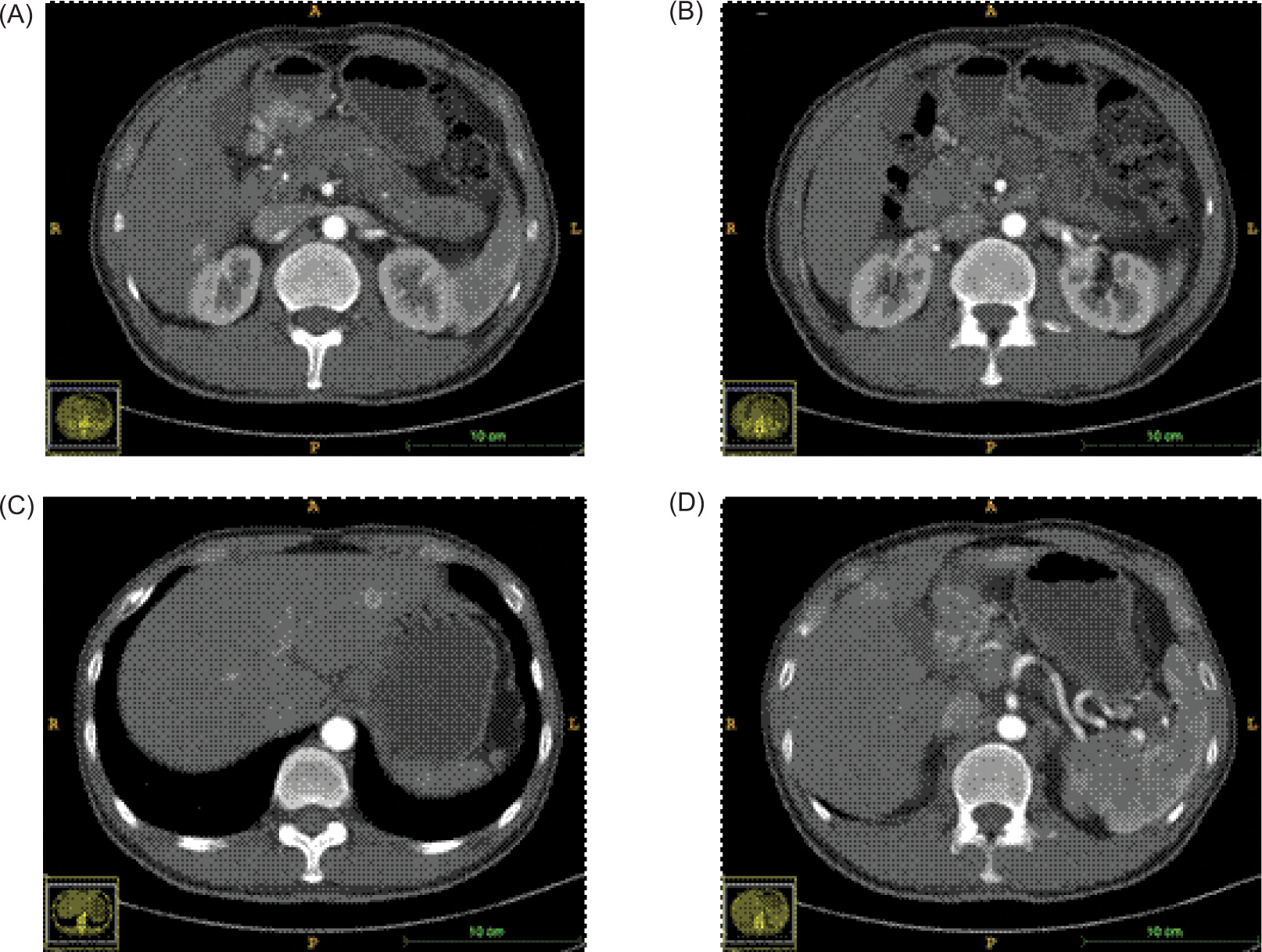 Figure 1: CT scanning during the first diagnosis (arterial phase). (A) lesion in the gastric antrum; (B) lesion in the left renal hilus; (C, D) lesions in the liver.