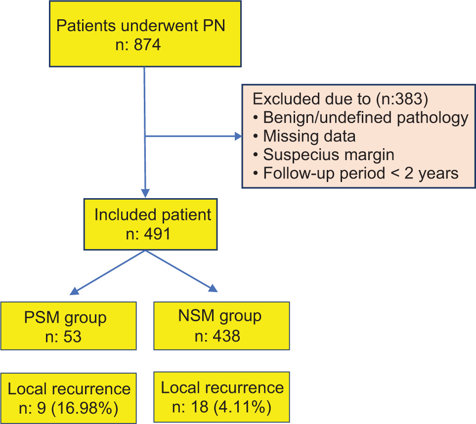 After obtaining Institutional Ethics Committee approval from Necmettin Erbakan University (ethic number: 2023/4104), a retrospective data analysis was performed by the authors from 6 tertiary hospitals in different regions of Türkiye. Data of 874 patients that underwent PN from 6 centers were evaluated. Patients with benign or undefined pathology, suspicious surgical margins, or incomplete data, as well as those with a follow-up period of less than 2 years, were excluded from the study. Finally, 53 patients with PSMs (the PSM group) and 438 patients with NSM (the NSM group) were included to the present study (Figure 1).