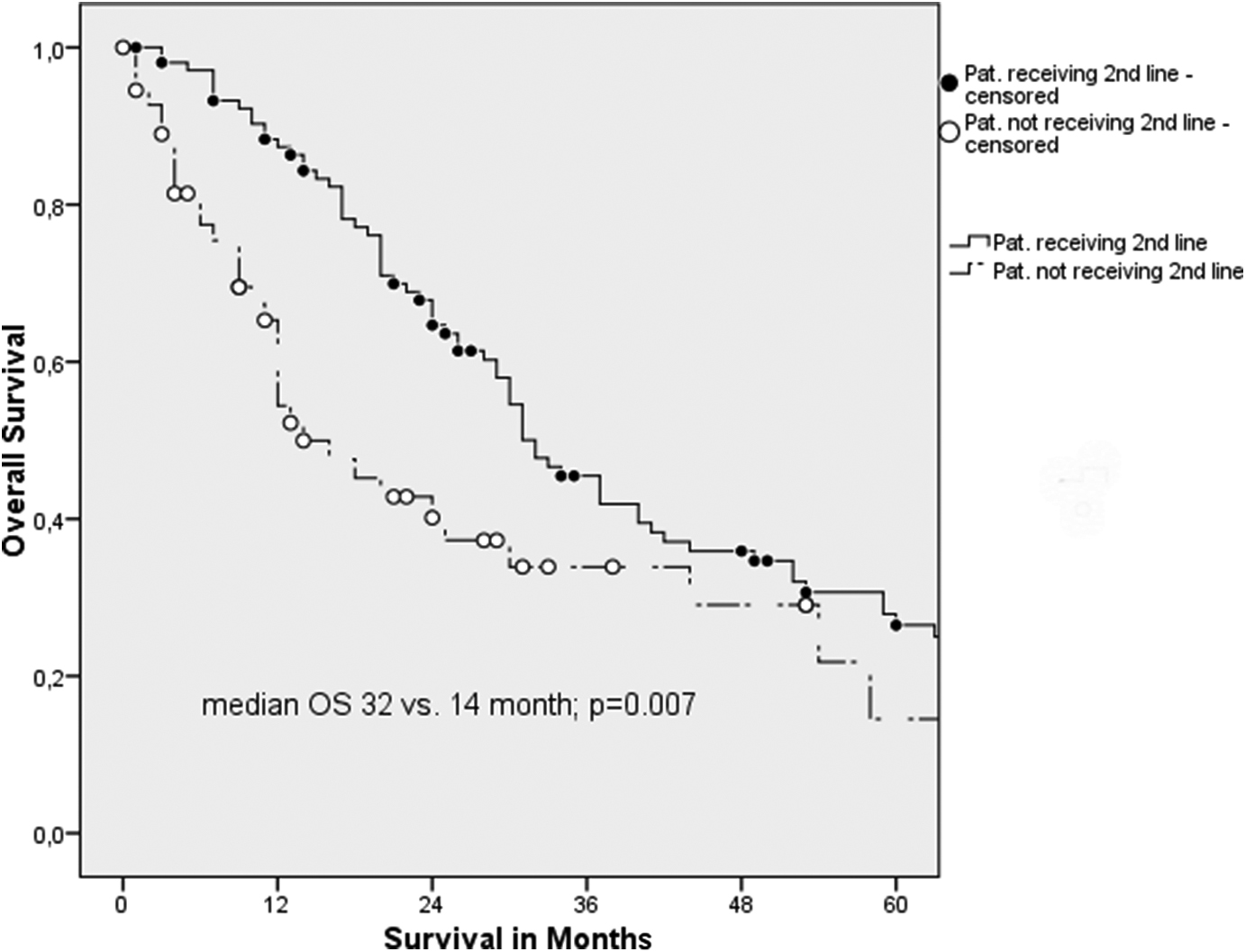 Figure 1. Kaplan–Meier analysis displaying improved median OS for patients receiving second-line therapy (32 versus 14 months; P = 0.007).
