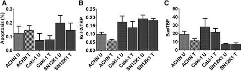Figure 1. Lack of effect of maslinic acid on apoptosis and apoptosis-regulatory molecules. The effect of maslinic acid on apoptosis of RCC was studied 24 hours after incubating the cells with maslinic acid. Morphologically, maslinic acid did not induce any significant changes in apoptosis (A). These results were further confirmed at the molecular level by the lack of significant changes in the expression of the antiapoptotic molecule Bcl-2 (B), and the proapoptotic molecule Bax (C). U: untreated; T: treated with maslinic acid.