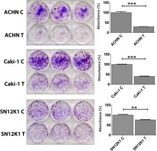 Figure 3. Maslinic acid significantly reduced colony formation. Adhesion and colony formation are essential steps in distant metastasis. Maslinic acid significantly decreased colony formation of all three cell lines. Left, representative images showing colony formation. Right, quantification of the dye. **P < 0.01; ***P < 0.001. C: untreated control; T: treated with maslinic acid.